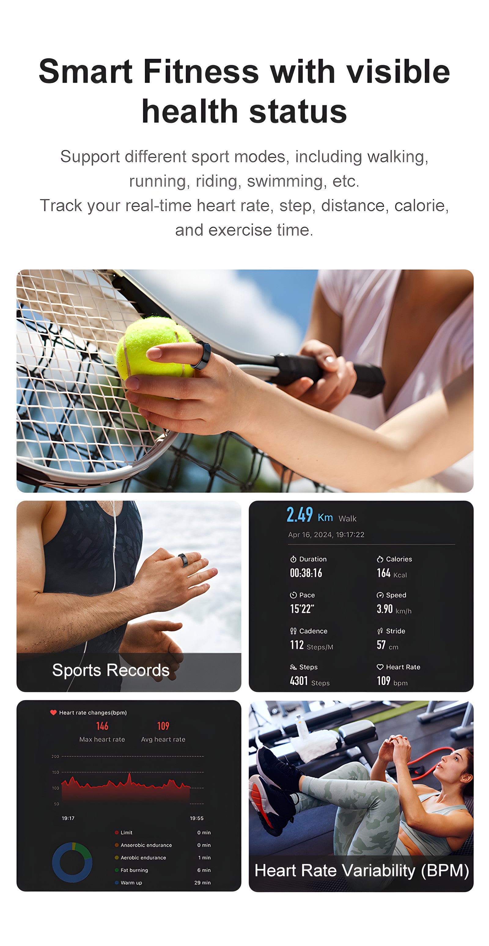 Been using this smart ring for a few weeks now, and it's pretty impressive. It tracks my heart rate, sleep, and blood oxygen levels, which is cool. It's water-resistant, so no worries wearing it during workouts or washing hands. Syncing it with my phone was easy, the Bluetooth connection is reliable.The design is pretty good, its not too bulky on the finger but definitely noticable. Battery life's decent, lasts a couple of days on a single charge. Sleep tracking seems accurate, it's interesting to see my sleep patterns. The app could be a bit more user-friendly, but it's not a deal-breaker.Overall, it's a handy little gadget for keeping an eye on basic health metrics. If you're into fitness or just curious about your health stats, this ring's a neat alternative to traditional fitness bands and a great conversation starter.