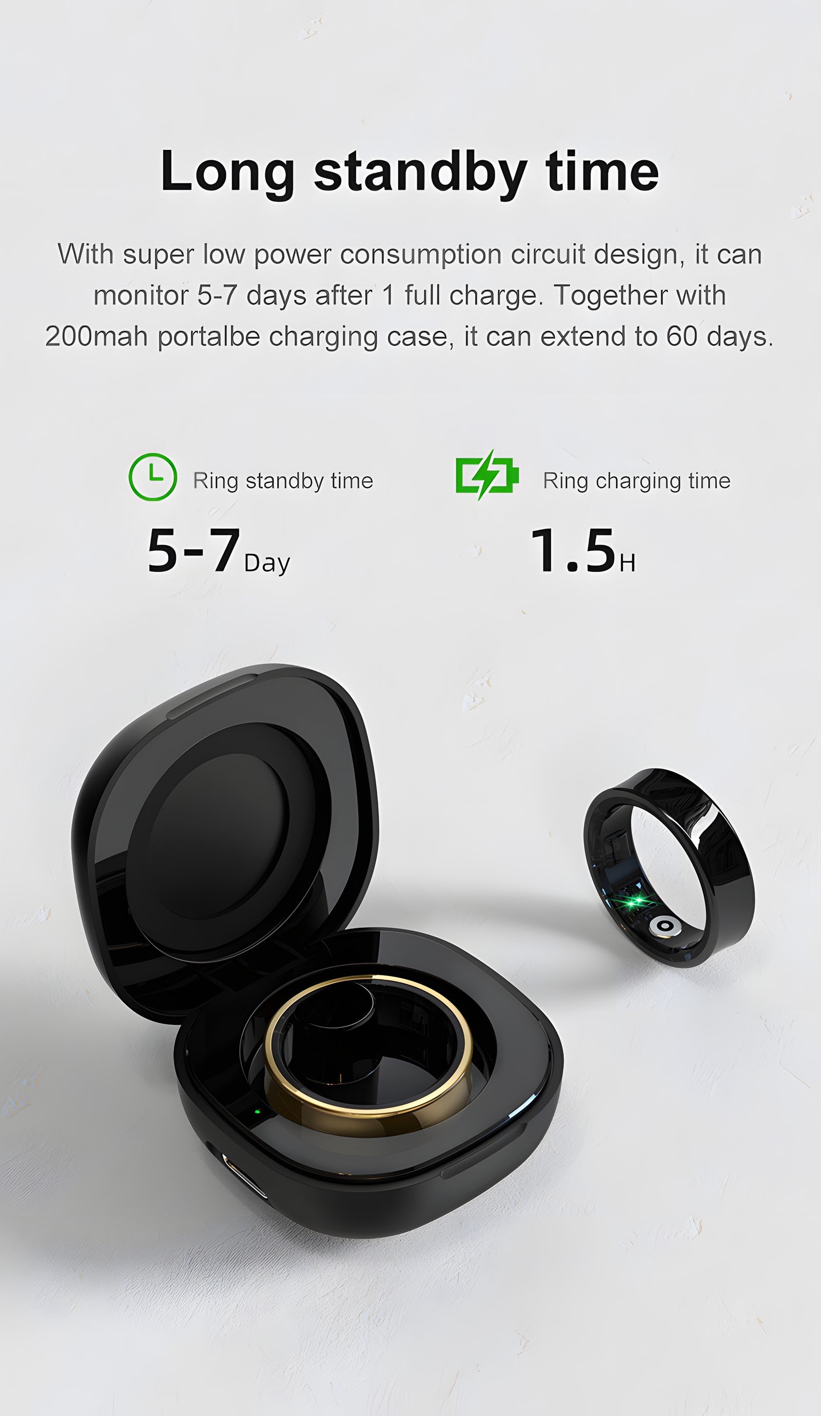 ◉The charging case comes with a 200mAh battery that allows for portable charging of your ring and up to 30 days of battery life.
