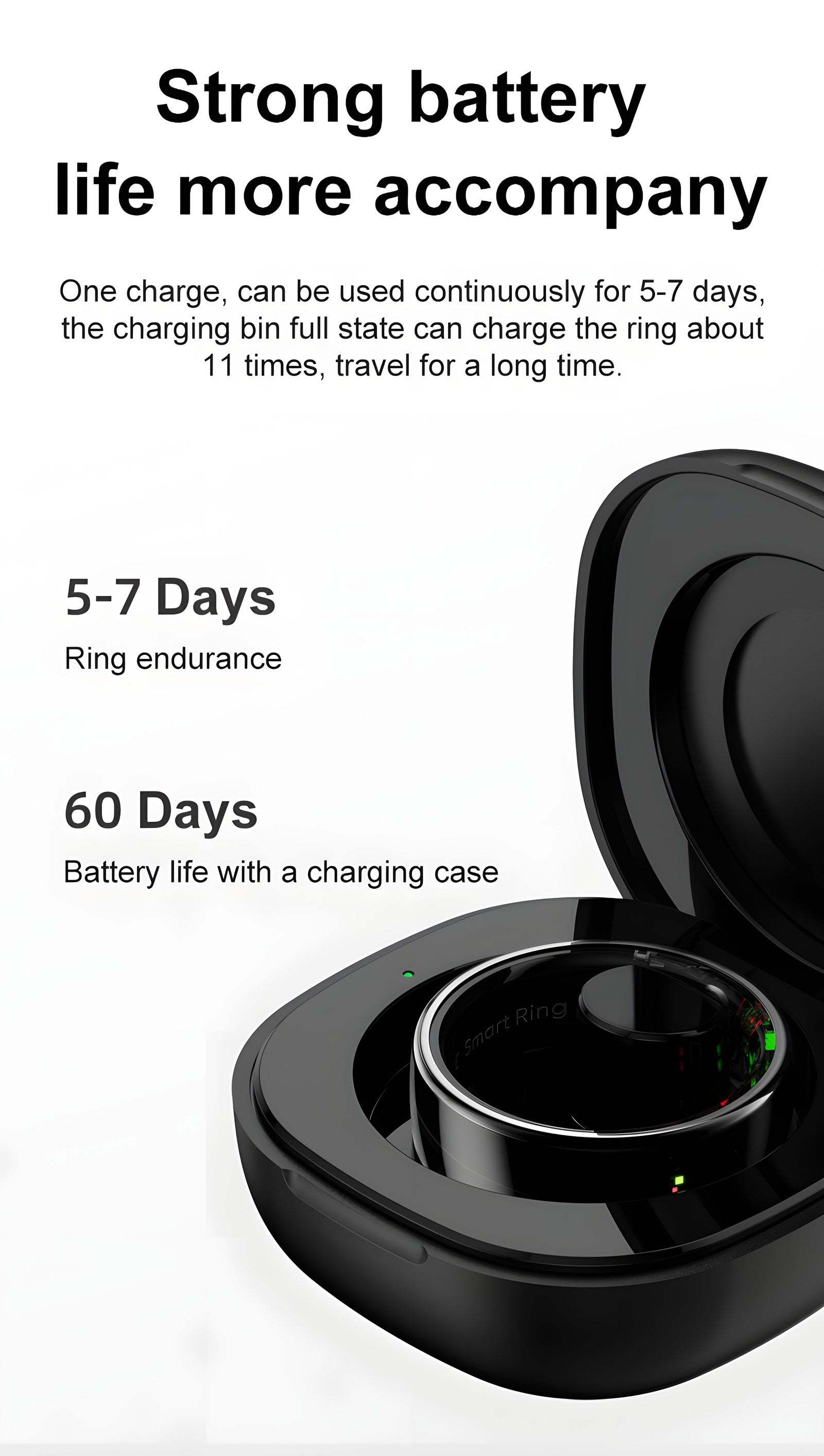 ◉The charging case comes with a 200mAh battery that allows for portable charging of your ring and up to 30 days of battery life.
