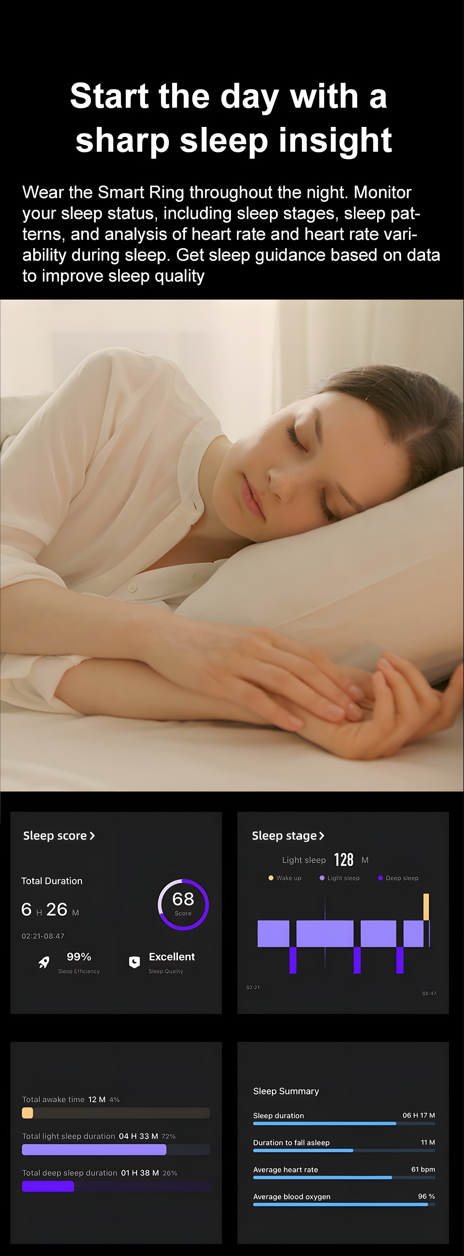 - Sleep quality: sleep duration, sleep stages, nighttime vital signs